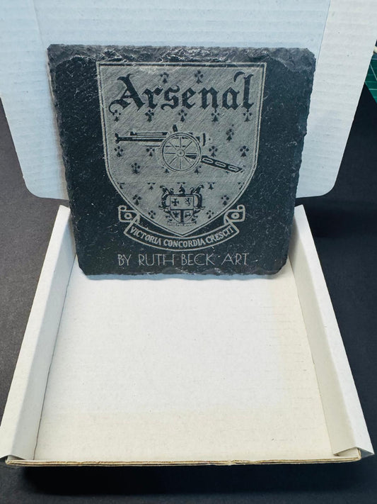 ARSENAL VCC CREST PAINTING BY RUTH BECK SLATE COASTER x 1. Charity Donation from Sale.