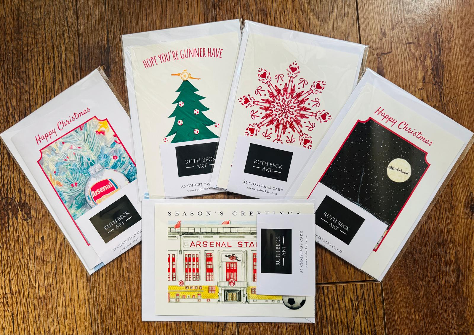 A5 Christmas Cards with unique Arsenal watercolour painting designs by Ruth Beck.