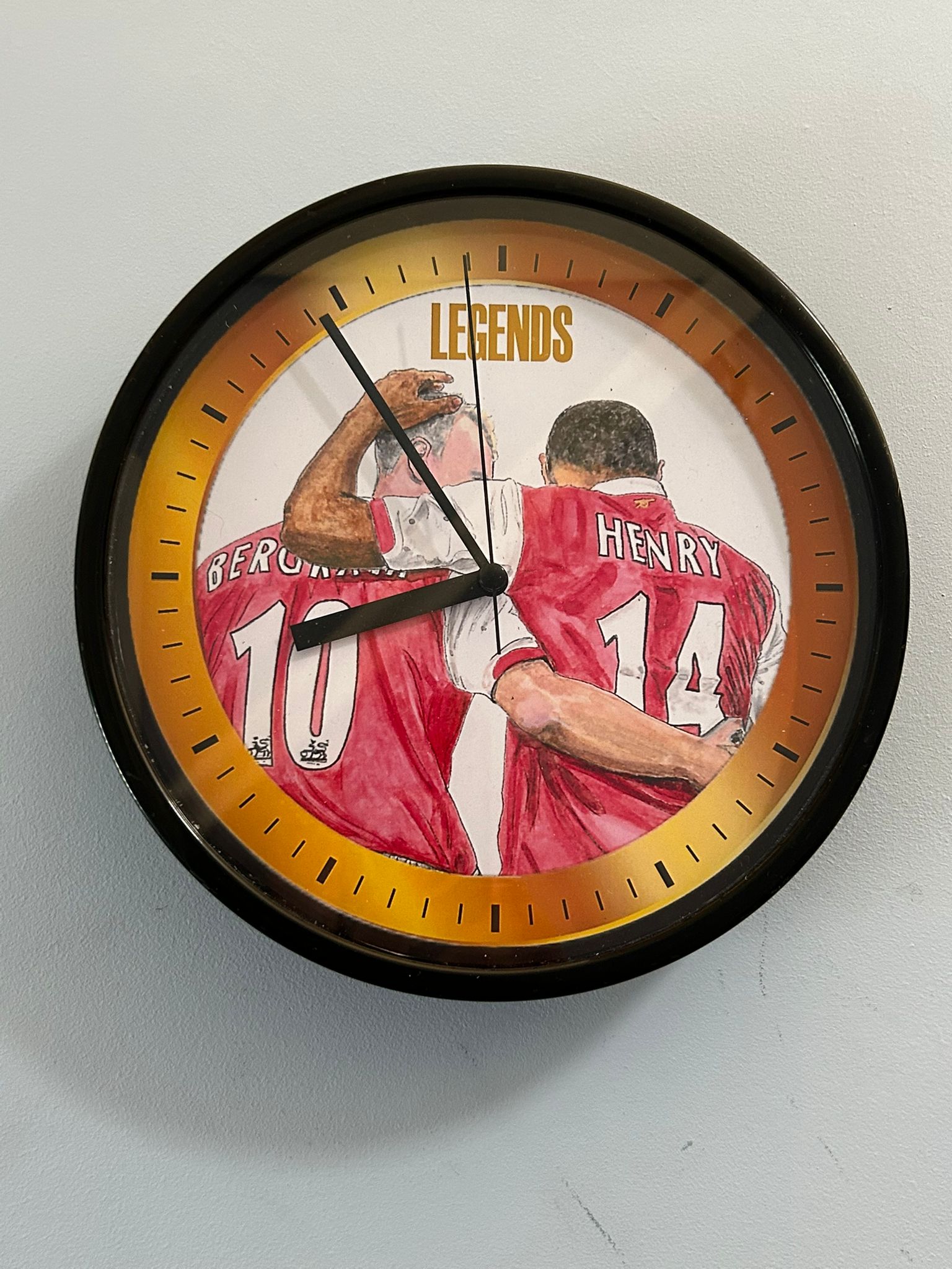 Clock featuring artwork by Ruth Beck Art of the watercolour painting of Arsenal Players Bergkamp and Henry - Gold Version