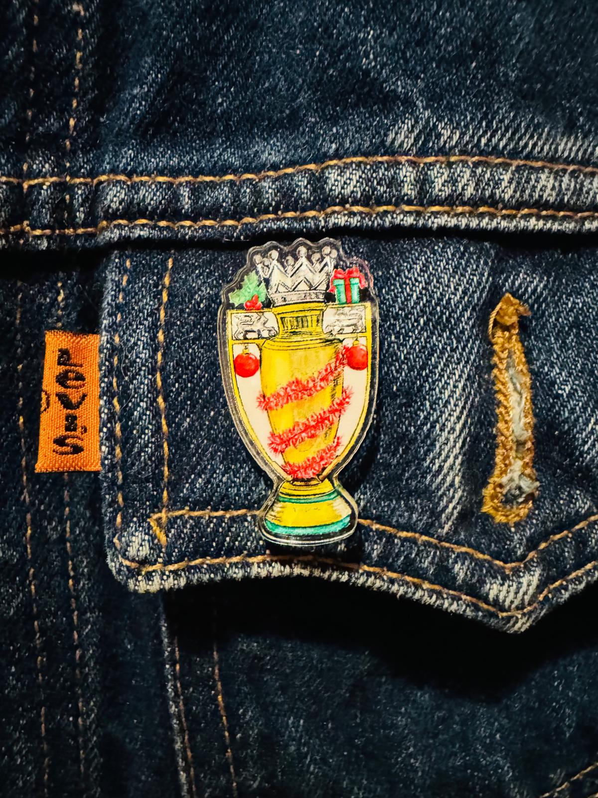 CHRISTMAS TROPHY BADGE - Gold Trophy - Custom Pin Badge - By Ruth Beck Art